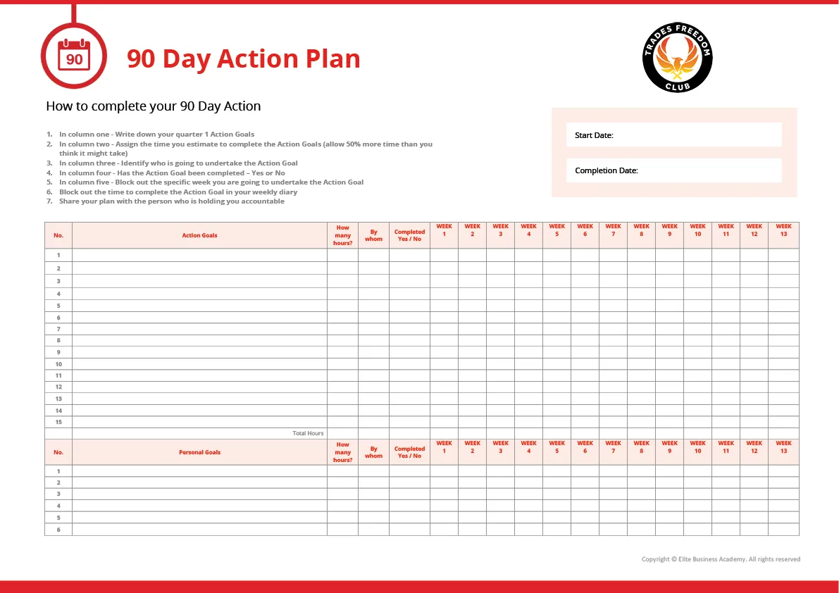 The final step is to create a 90 day action plan. This will identify every goal and milestone that has to be completed over the first quarter or 90 days. This powerful plan is then broken down into weekly tasks and added to your default diary.